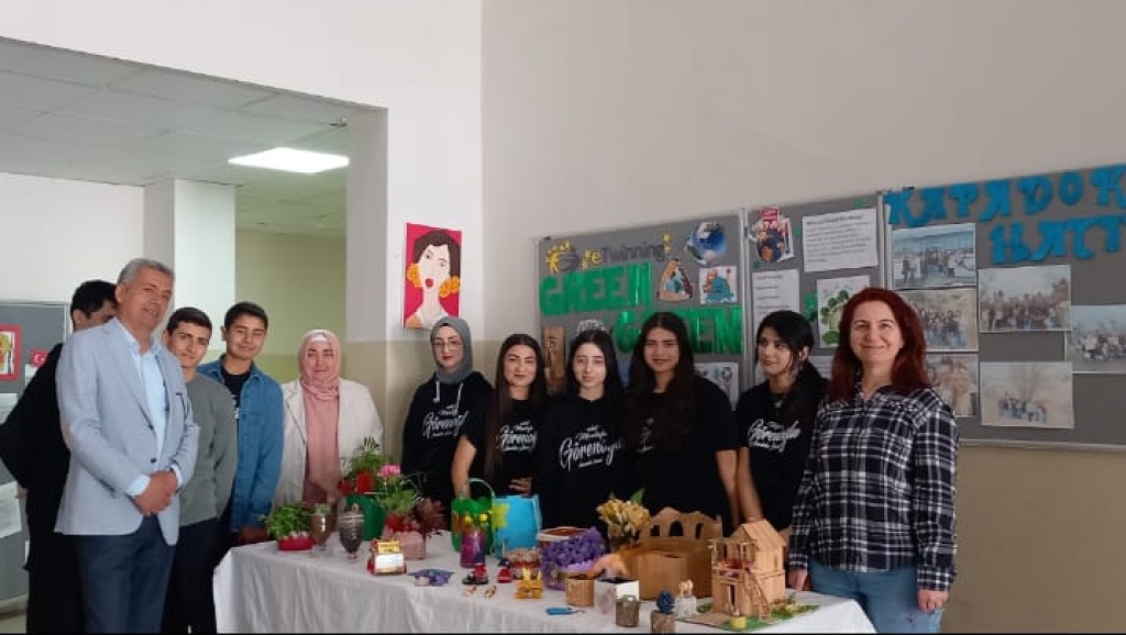 Green Green e Twinning projesi Danışman öğretmenleri Songül Acar ve Gül Can ve proje öğrencileri geri dönüşüm malzemelerle hazırladıkları ürünlerle Sanat sergisi hazırlayarak doğal çevreyi ve kaynakları koruma, çevre bilincine dikkat çeken bir etkinlik yaptılar.